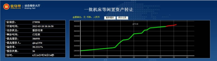 此次活动共有22位竞买人参加网络竞价,起拍价为279950.00元整,经过36次报价,最终以386950.00元整成交,项目增值率达38.0%。