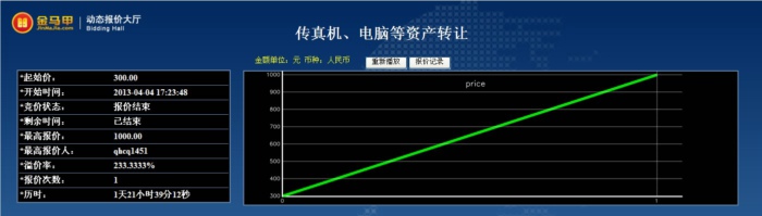 此次活动共有7位竞买人参加网络竞价,起拍价为300.00元整,经过1次报价,最终以1000.00元整成交,项目增值率达233.0%。