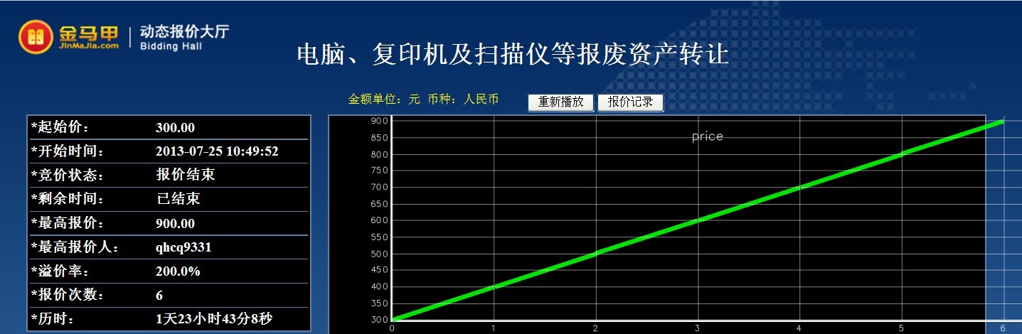 此次活动共有7位竞买人参加网络竞价,起拍价为300.00元整,经过6次报价,最终以900.00元整成交,项目增值率达200.00%。