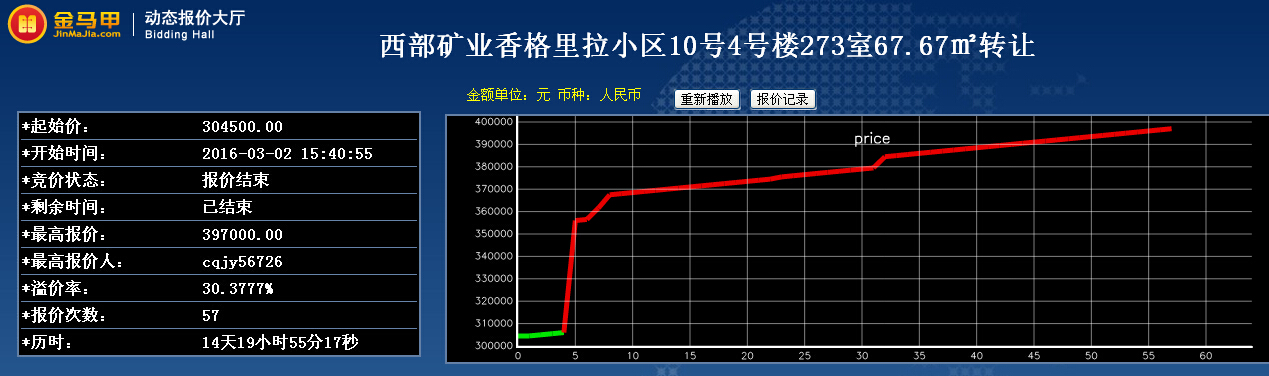 此次活动共有9位竞买人参加网络竞价,起拍价为30.45万元整,经过57次报价,最终以39.7万元整成交。
