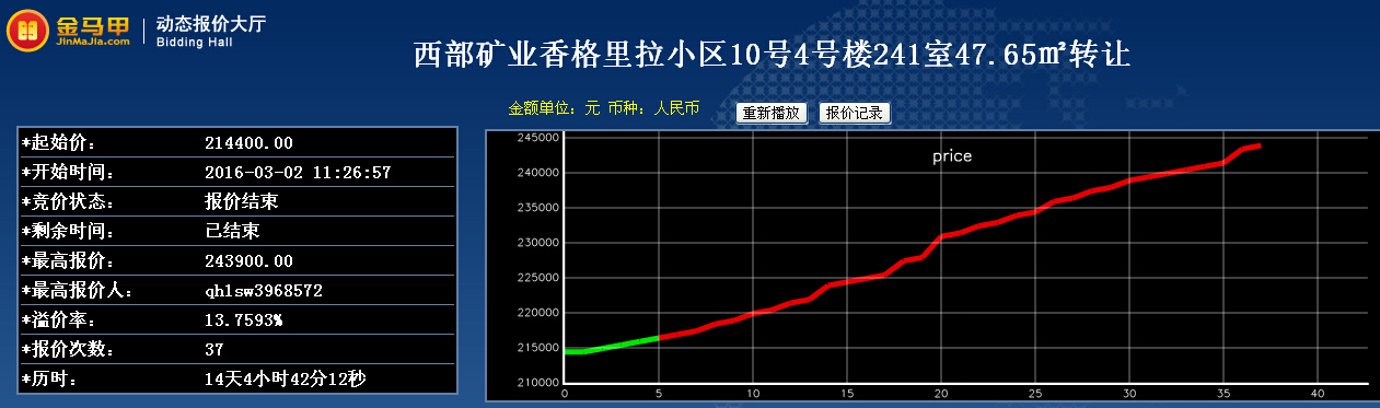 此次活动共有6位竞买人参加网络竞价,起拍价为21.44万元整,经过37次报价,最终以24.39万元整成交。