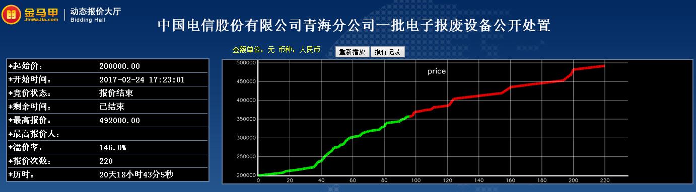 此次活动共有17位竞买人参加网络竞价,起拍价为200000元,经过220次报价,最终以492000元成交。