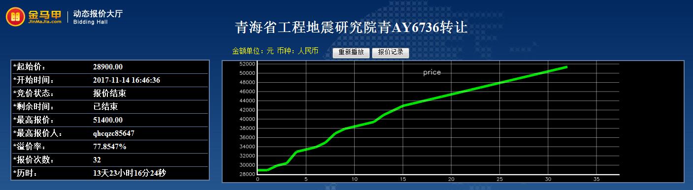 受青海省工程地震研究院委托,青海省产权交易市场于2017年11月14日对其持有的车辆青AY6736(项目编号GZ17QH051106)实行公开网络竞价处置。