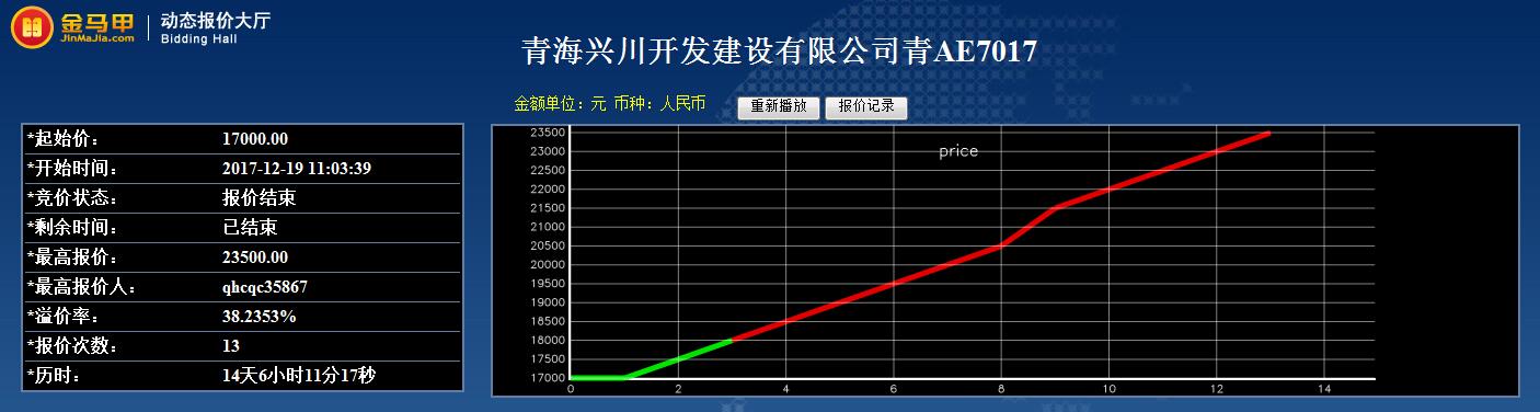 受青海兴川开发建设有限公司委托,青海省产权交易市场于2017年12月19日对其持有的车辆青AE7017(项目编号GZ17QH051217)实行公开网络竞价处置。