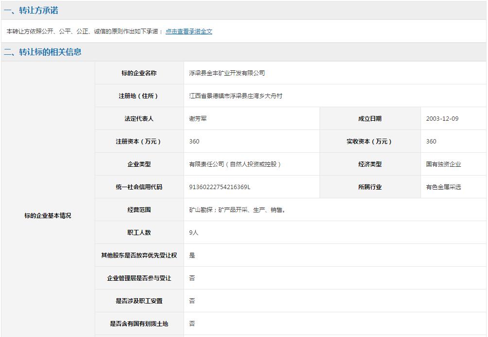浮梁县金丰矿业开发有限公司100%股权转让信息披露公告
