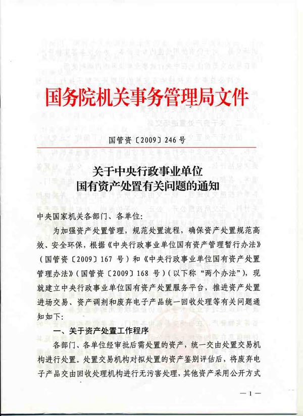 关于中央行政事业单位国有资产处置有关问题的通知(国管资[2009]246号)