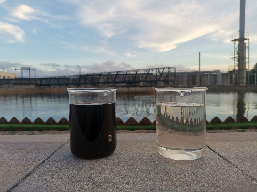 电子束治污技术水质处理前后对比(左边处理前,右边处理后)。