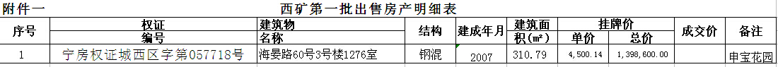 受西部矿业集团有限公司委托,青海省产权交易市场对该公司所属西宁市海晏路60号申宝花园3号楼1276室住宅公开转让,建筑面积为310.79平方米,挂牌价139.86万元。