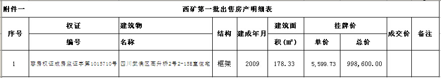 受西部矿业集团有限公司委托,青海省产权交易市场对该公司所属成都市武侯区高升桥2号2-15E室住宅公开转让,建筑面积为178.33平方米,挂牌价99.86万元。