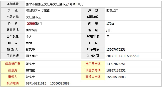 我市场接受个人的委托,对其所有的西宁市城西区文汇路文汇园小区1号楼3单元3221室四室两厅两卫一厨的简装住宅、建筑面积约170平米对外出租,每月租金为2500元。 对受让方的基本要求及受让条件详询青海省产权交易市场网站(www.qhcqjy.com.cn)和房产市场517网(www.fcsc517.com),有意租房者,请到青海省产权交易市场交易部报名,并于公告截止日2017年12月22日16时前将交易保证金人民币:贰仟元整(¥:2000元)汇入指定账户。