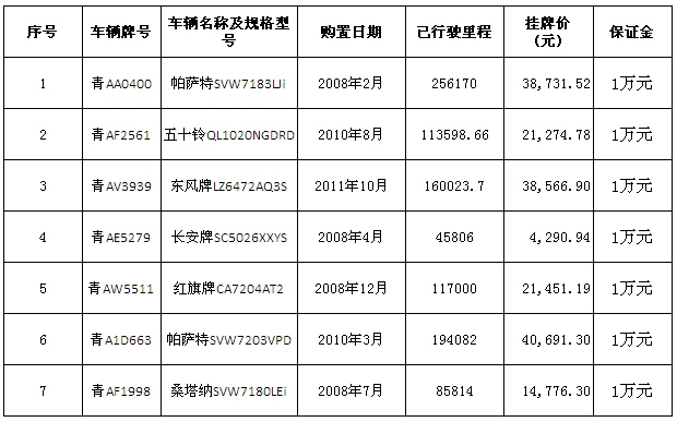 对受让方的基本要求及受让条件详询青海省产权交易市场网站www.qhcqjy.com.cn,有意受让者,请到青交市场报名,公告期为2019年3月4日至2019年3月15日,并于公告2019年3月15日16时前将交易保证金人民币:壹万元整/辆(¥:1.00万元)汇入指定账户(保证金以到账时间为准)。