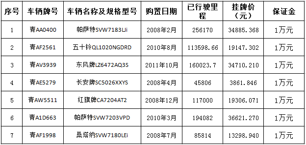 对受让方的基本要求及受让条件详询青海省产权交易市场网站www.qhcqjy.com.cn,有意受让者,请到青交市场报名,公告期为2019年3月21日至2019年4月3日,并于公告2019年4月3日16时前将交易保证金人民币:壹万元整/辆(¥:1.00万元)汇入指定账户(保证金以到账时间为准)。