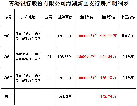 青海银行股份有限公司海湖新区支行所持有的乐都县新乐街3套商业房产公开挂牌转让公告