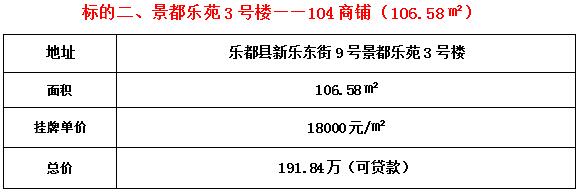 标的二位于景都乐苑3号楼104号商铺,建筑面积106.58平米,1/17层,临街商铺,套内面积100.92平米。