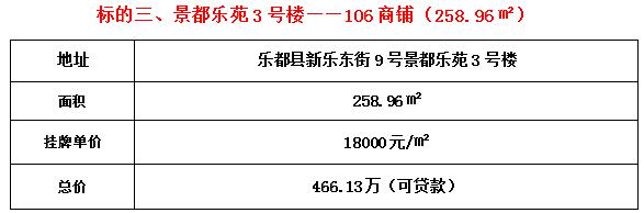 标的三位于景都乐苑3号楼106号商铺,建筑面积258.96平米,1/17层,临街商铺,套内面积245.2平米。