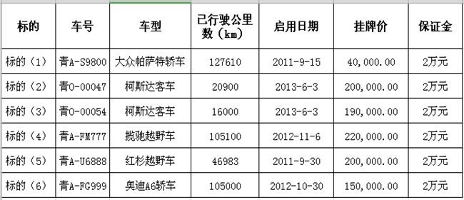 对受让方的基本要求及受让条件详询青海省产权交易市场网站www.qhcqjy.com.cn,有意受让者,请到青交市场报名,公告期为2019年1206日至2019年1219日,并于公告2019年121916时前将交易保证金人民币:贰万元整/辆(¥:2.00万元)汇入指定账户(保证金以到账时间为准)。