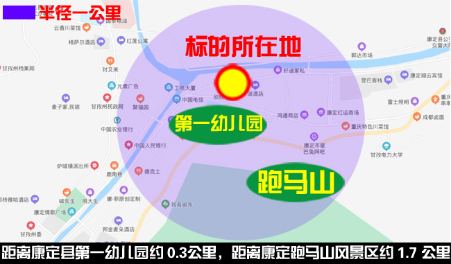 位于康定市城区西南方向,距离康定县第一幼儿园约 0.3公里,距离康定跑马山风景区约 1.7 公里,该区域系康定市较成熟的住宅聚集区域,地理位置较好。