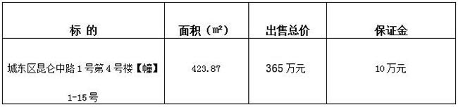 受转让方委托,青海省产权交易市场对其位于城东区昆仑中路1号第4号楼【幢】1-15号房屋(华庭仁和国际)进行公开转让,建筑面积:423.87㎡,挂牌价:365万元整。