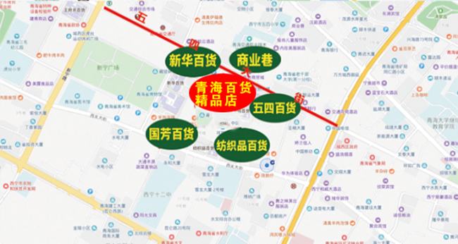 青海百货精品店大楼位于五四大街39-1号,坐落五四大街、力盟商业街交汇处,建筑面积32376.45平方米,共10层内有苏宁,酒店等,现已全部出租,商业气氛好,周边商业步行街、各大商场林立,处于西宁市最繁华的商圈--新宁广场商圈中心,商业价值凸显。