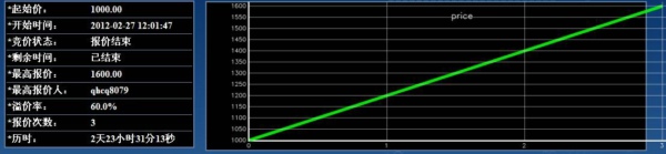 此次活动共有5位竞买人参加网络竞价,起拍价为1000.00元整,经过3次报价,最终以1600.00元整成交,项目增值率达60%。