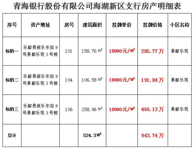 关于青海银行股份有限公司海湖新区支行所持有的乐都县新乐街3套商业房产公开挂牌转让公告