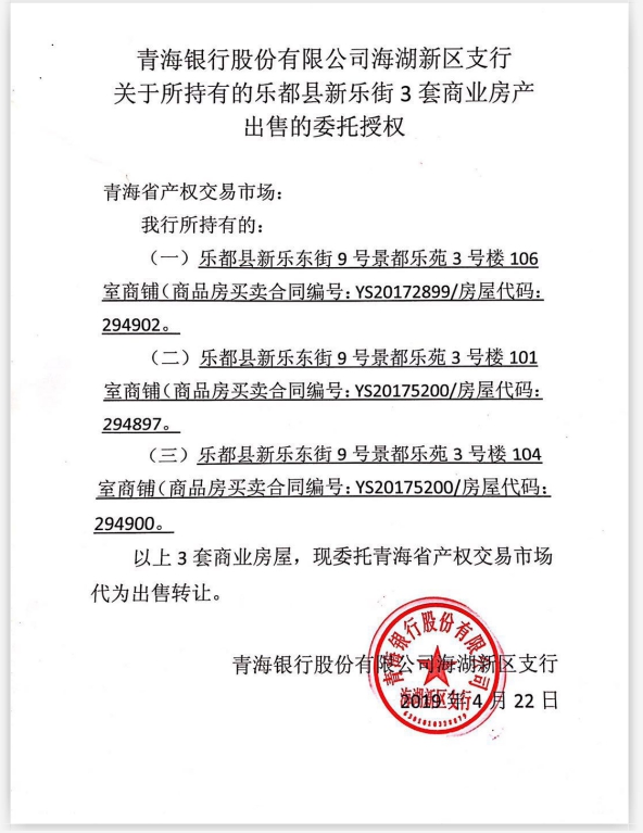 受青海银行股份有限公司海湖新区支行委托,依据《中华人民共和国企业国有资产法》、  《企业国有资产交易监督管理办法》(国务院国资委、财政部第32号令)、《青海省企业国有资产交易监督管理办法》(青国资产〔2017〕339号),青海省产权交易市场对青海银行股份有限公司海湖新区支行所持有的乐都县新乐东街3套商业房产进行公开转让。