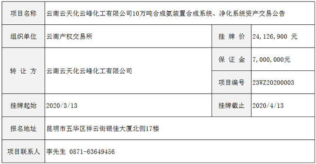 云南云天化云峰化工有限公司10万吨合成氨装置合成系统、净化系统资产交易公告