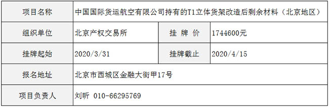 中国国际货运航空有限公司持有的T1立体货架改造后剩余材料(北京地区)