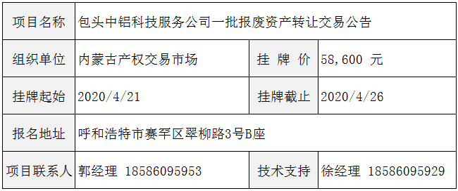 包头中铝科技服务公司一批报废资产转让交易公告