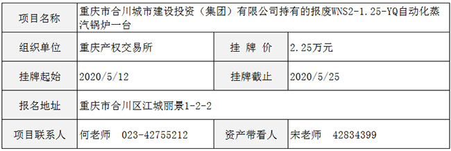 重庆市合川城市建设投资(集团)有限公司持有的报废WNS2-1.25-YQ自动化蒸汽锅炉一台