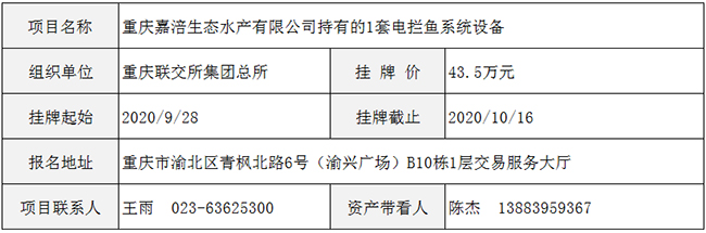重庆嘉涪生态水产有限公司持有的1套电拦鱼系统设备