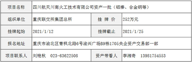 四川航天川南火工技术有限公司资产一批(铝棒、合金钢等)